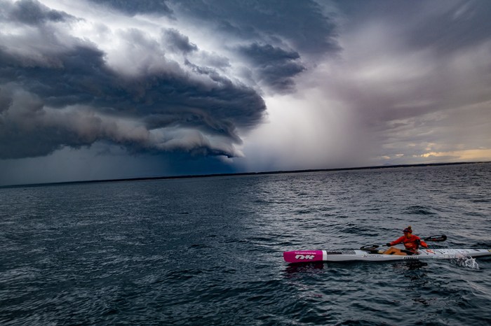 Bonnie It takes an enormous toll on everyone, and as I write about very much in my book, there’s times where I didn’t know if Matt and I were going to get through it. And I think that really comes out throughout this documentary, the importance of those around me and the sacrifices they made. It’s one thing for me to climb into my ski and paddle a ridiculous amount of kilometres, but what my crew were going through, and that was Matt sometimes sitting on land for weeks at a time, not being able to have contact with me. That’s him getting a phone call as I’m five hundred kilometres out to sea, hearing that I’ve just been concussed at nighttime and floating in the ocean, waiting for my boat to come back to me, that’s me not knowing what to say to him when I come to shore. And that was all part of that process of me as an athlete, not really wanting to fully let go or release those emotions because I’m back in that ski the next day, paddling all day again. So I really think that this documentary does highlight the importance of your team, your village around you, and you cannot achieve any sporting endeavour, or even adventure, without that crew. I strongly believe that. And there was one day throughout this paddle I set out to paddle alone, and I felt incredibly lonely and isolated, and it was nowhere near as fun. And I made sure that I said to my crew, “I never want to do that again.” I’m so lucky to have been surrounded by an incredible crew, and I really think that their sacrifices are highlighted in this documentary.