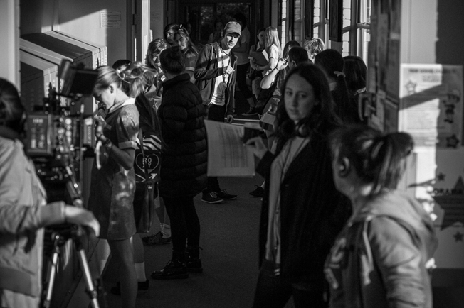 The shoot was two days and we used two different schools – one for the interior location and the other for all the exteriors. When we scheduled the shoot, producer Chloe Lawrence-Hartcher and I discussed the possibility of bad weather on the second day, which was our exterior day, but we realised there was nothing we could do because we only had those two days to shoot over and interior shoot day could not be moved. So we just crossed our fingers and hoped for the best, but of course it rained on our exterior day. We ended up waiting undercover and rushing out to shoot whenever there was a break in the rain. We had all these extras that we had to send home. I restaged one of the scenes and cut another scene out. Everyone was great though. Visually it’s much better than if it was a bright sunny day.