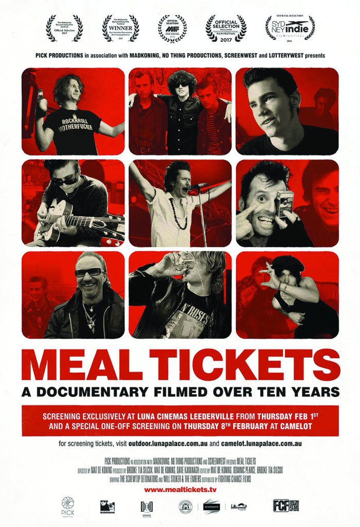 Meal Tickets is a cautionary tale of life in the world of modern day rock ‘n’ roll, and its realities versus its aspirations. De Koning has captured the rollercoaster journey of a young Perth band, the Screwtop Detonators, their manager Dave Kavanagh (an ex-mentor to The Libertines) and their one-time roadie, Will Stoker.