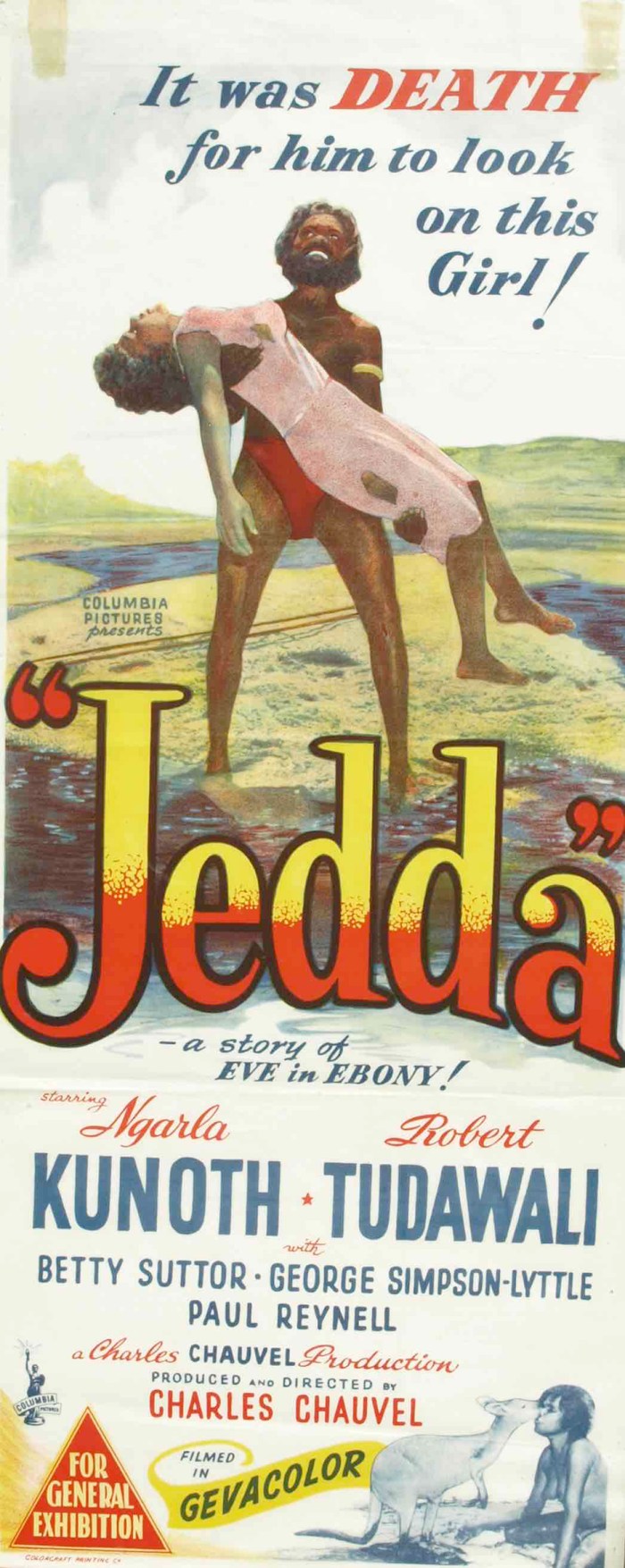 Colour production came to Australia with the 1955 Charles Chauvel film Jedda. The film was the first to star two Aboriginal actors, Robert Tudawali and Ngarla Kunoth, in the leading roles.