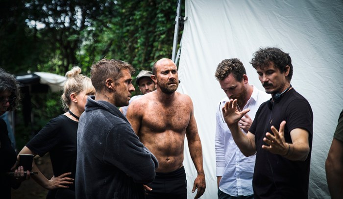 Hugh Sheridan, Josh McConville and director Storm Ashwood on the set of Escape and Evasion.