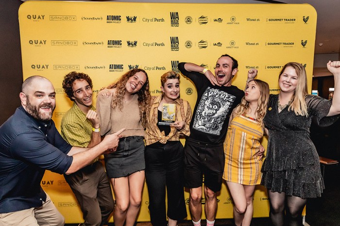 Matthew Eeles (Festival Director) with A Safe Space for All filmmakers James Wilson, Kate Muir (DOP), Shannon Taylor (Writer and Director), Leslie Hornung (Writer), Ciara Kerr (Second Camera) and Jasmine Leivers (WA Made Festival Coordinator). Photo by Ryan Ammon.