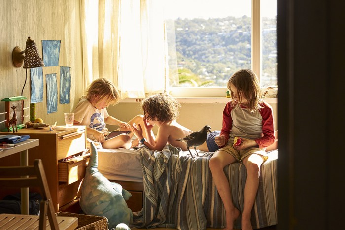 We originally set out to find boys that are a lot like the Bloom boys, they’re surfers, and they’re super active, and skateboarders, et cetera. But I ended up getting a kid from inner city Melbourne, a kid from country Victoria, and a kid in the inner West of Sydney. And regardless of their skillset, I think what I was looking for was the right energy between the boys. And they just got on, they got on like brothers and they sort of fought like brothers. And in the end, you could just send them into any scene or any situation and they would just play out their role. They would just be brothers, and I love that. It’s a bit like the kids and animals thing. You can’t really control them, and all you can do is embrace them and what they’re doing, and I love that. I love the chaos that they brought to set. It’s almost like having three birds on set when you had those three boys on set. [Laughs].