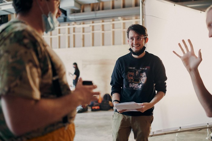 Jackson Tozer and director Riley Sugars on the set of Hatchback.