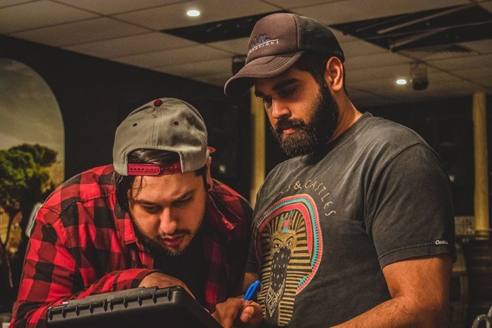 Writer and director Matthew C. Vella discussing shot lists with 1st AD Nilendra Fonseka. Photo by Joey Cruz Andres