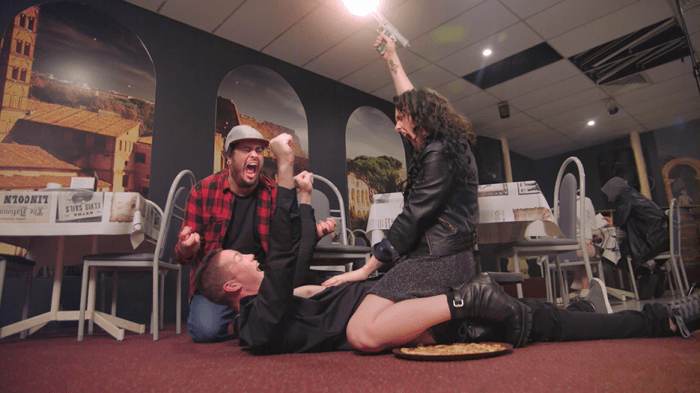 This obviously made editing both a dream and a nightmare as we’d have a hundred jokes to choose from, with many of them left on the cutting room floor. We did this in multiple scenes throughout the film, but this wasn’t the only way we worked improv into our script. In between takes, I would listen to the actors talk to each other about the scene, and on a few occasions I would hear a funny comment and suggest they work it into the scene. These would often be small little tags riffing off jokes. Of course, actual improv occurred as well, particularly in our pizza scene towards the end. In the script, it was only a small exchange of a few lines, but the final scene goes for over a minute. In the moment, we just realised that scene kept building adrenaline, and it needed to be longer to make that build up and release feel even more satisfying. So, we just kept stretching out the scene and adding in more and more dialogue. The end result? Arguably the most memorable scene in the film. If we stuck to the script, we wouldn’t have achieved any of that. By allowing ourselves to play with it in the moment, we were able to create bigger and better laughs. If you pay close attention, you can see in some shots the actors are trying not to laugh. And that is all completely fine. Laughter is infectious. That’s why comedians perform for crowds and why sitcoms have laugh tracks. It may sound like a movie sin, but for comedy it’s golden.
