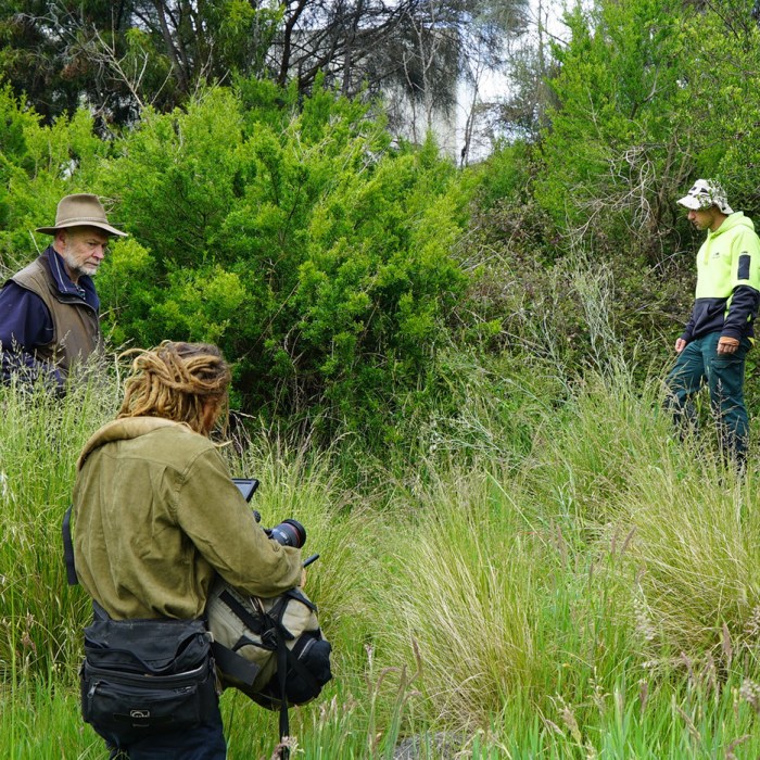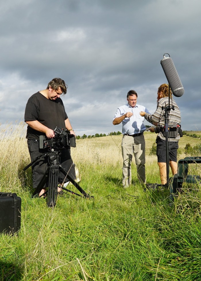 (L-R) Director, Brendan Guerin, camera assist, Thomas Brownlow and Hume ecologist, Eric Stone, filming in the Craigieburn grasslands near Hume Highway.