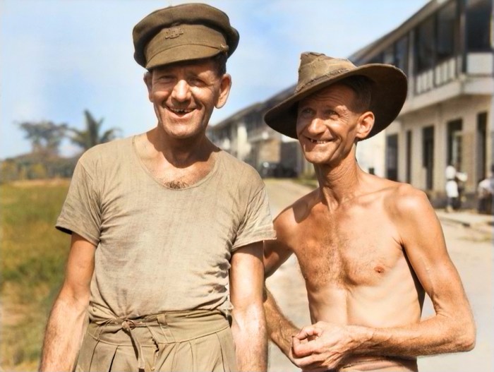 Singapore, 1945. Informal portrait of two ex-prisoners of war of the Japanese soon after their arrival at the Changi gaol in Singapore from Thailand. Source: Australian War Memorial, http://www.awm.gov.au